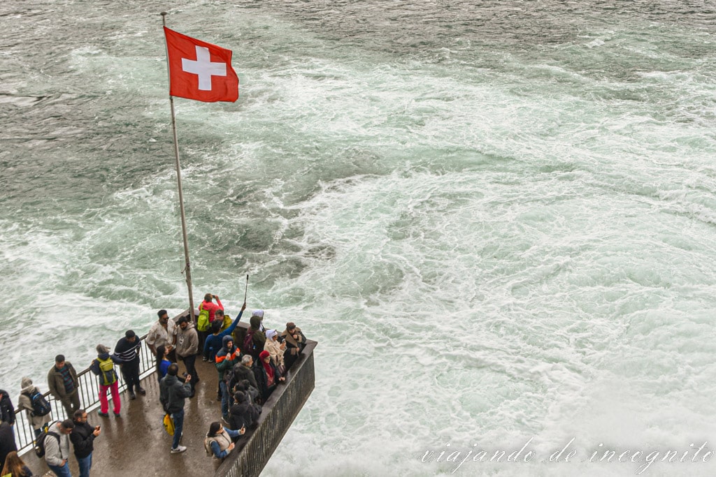 Y ¿Qué puedes hacer en la roca? pues subir por una escalera metálica hasta donde ondea la bandera suiza y disfrutar del ruido del agua y de las vistas. No obstante, después de haber hecho este viaje, dudamos de que merezca la pena, pues es la opción más cara y ya ves las cataratas del Rin desde muchas perspectivas si subes al castillo. Además, al ser muy popular, puede pasarte como a nosotros, que te pases la mitad del tiempo haciendo cola para poder asomarte.