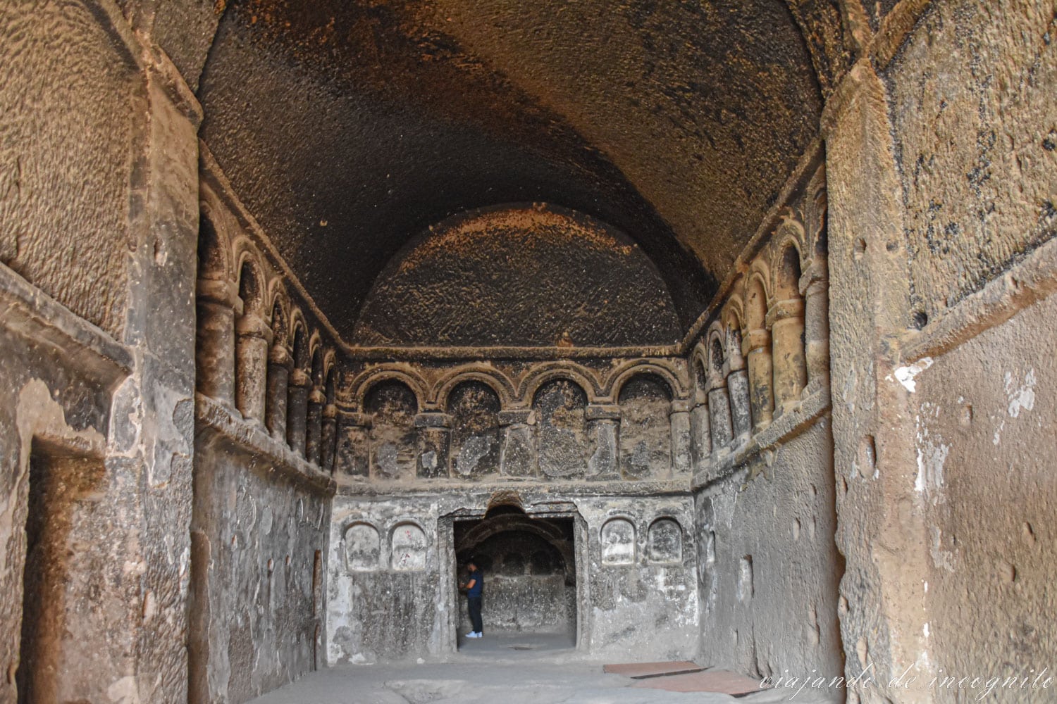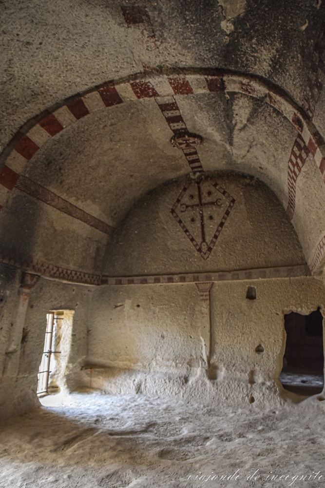 Las vistas volvían a ser muy buenas, con el castillo de Uçhisar al fondo. Al entrar, nos dieron una linterna, ya que para llegar a alguna de las salas había que cruzar pasillos completamente oscuros y muy estrechos, teniendo que ir a gatas. La iglesia no tenía apenas frescos y no nos pareció una parada imprescindible, pero nuestra hija se lo pasó en grande guiándonos con la linterna.