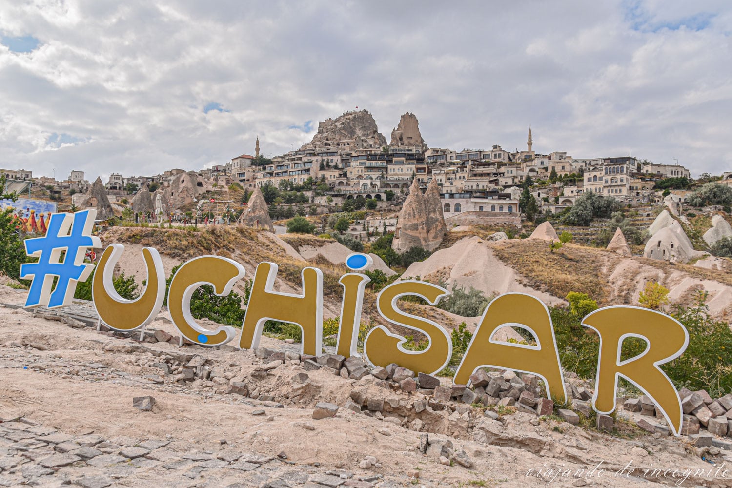 Enseguida llegamos a las letras de Uçhisar, donde había aparcado un autobús turístico y estaba repleto de gente, por lo que nos fuimos.