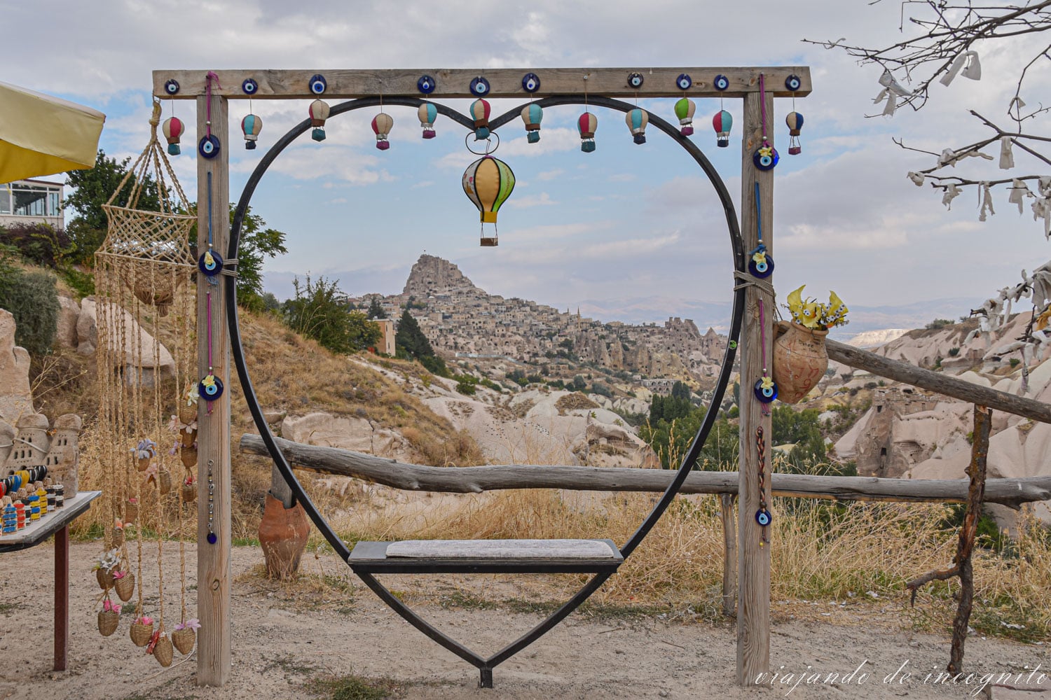 Los valles de la Capadocia puedes disfrutarlos de dos maneras, desde los miradores decorados con columpios, arcos y un montón de objetos más, o recorriendo sus caminos, no siempre bien señalizados.