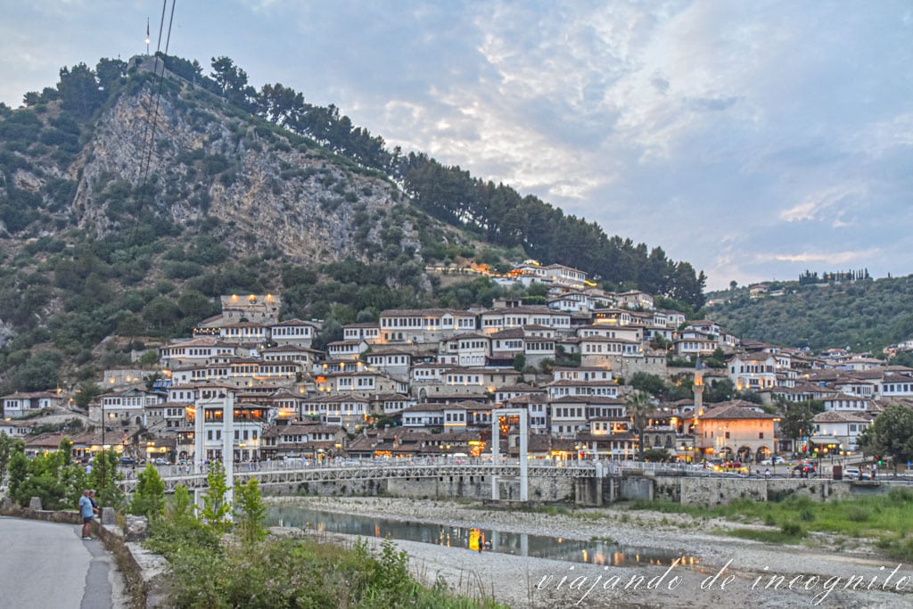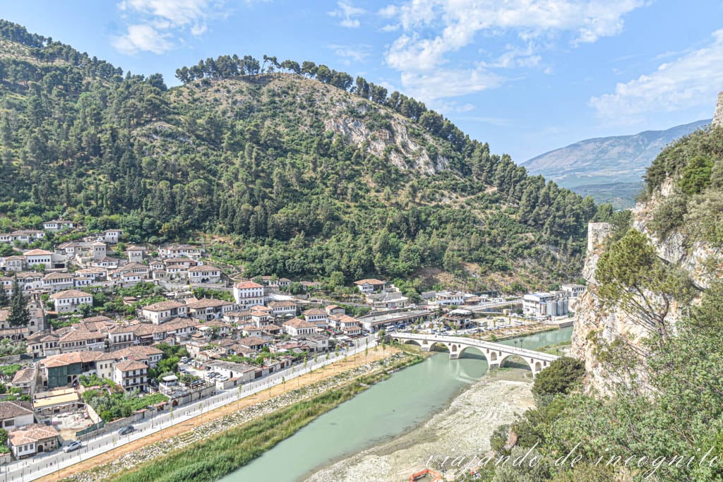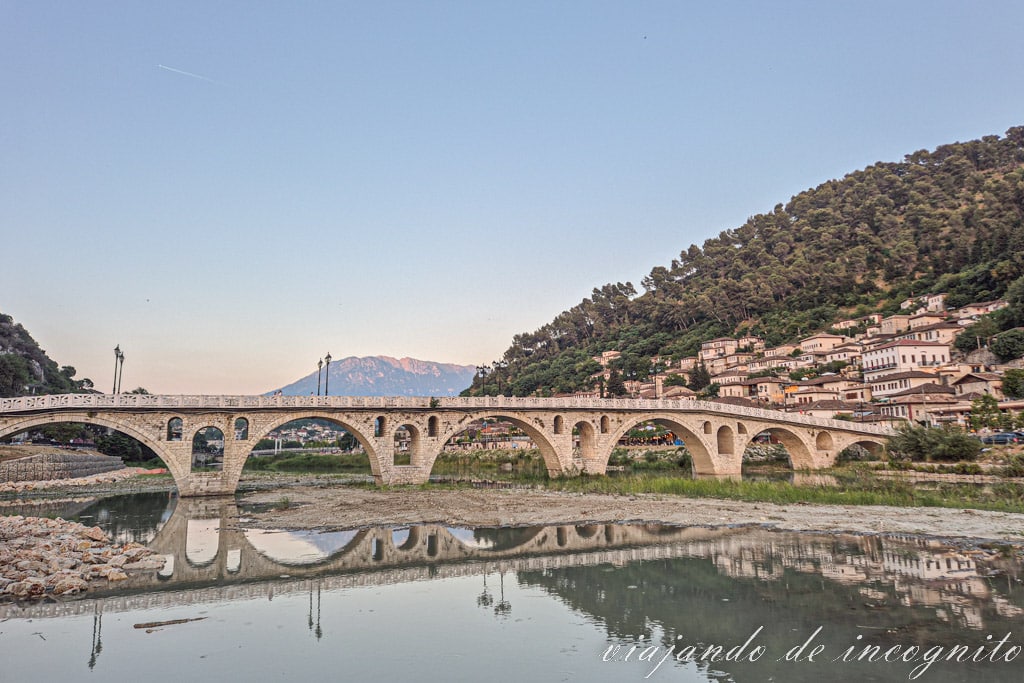 Una de las imágenes más conocidas de Berat es el puente de piedra de 7 arcos que une los barrios de Mangalem y Gorica. Y es que el conjunto del puente reflejado en el río con la colina del castillo al fondo es realmente bonita.