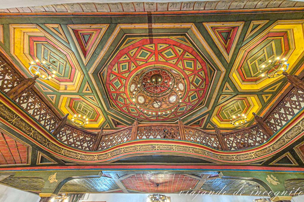 Igual su exterior no llama tu atención, pero espera a entrar en ella y levantar la cabeza para ver su techo de madera tallada, tanto el de la sala de oración como el del espacio reservado a mujeres, ambos pintados con vivos colores.