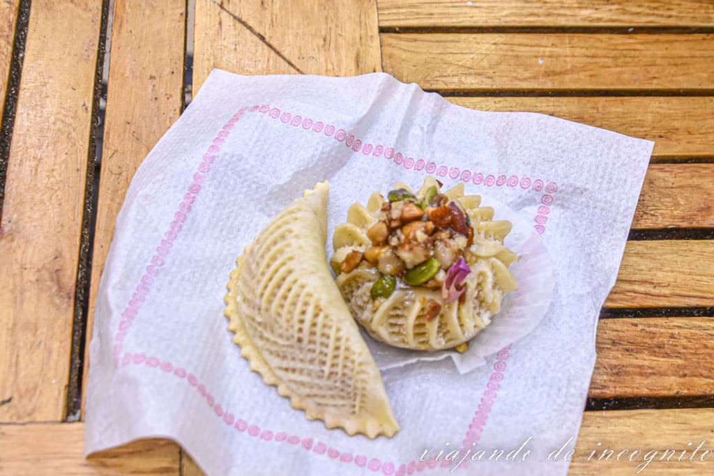Por otro lado, abundan los dulces de almendra, siendo uno muy conocido el cuerno de gacela, que tiene forma de media luna, pero no fue el que más nos gustó.