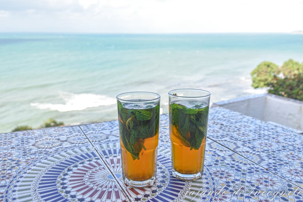 – Una es el popular café Hafa, que no es una cafetería al uso, sino una serie de terrazas con unas estupendas vistas al mar llenas de mesas. Aunque también puedes comer aquí, lo más recomendable es tomarte un té de menta, que costaba 12 MAD, pero en Ramadán cobraban 20 MAD. Está algo alejado, pero en nuestra opinión merece la pena acercarse. Está muy cerca de las tumbas Fenicias.