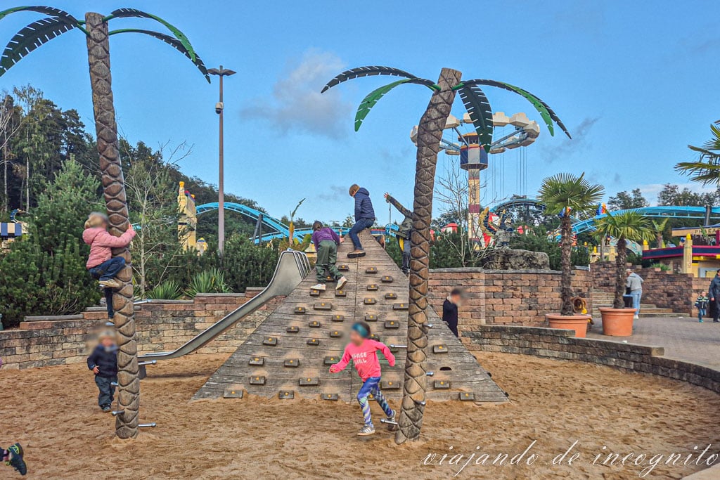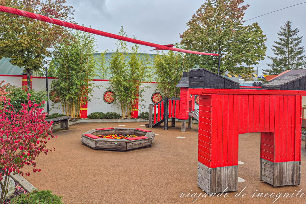 Aparte, hay columpios con una zona de escalada y un tobogán en forma de dragón, y una zona con piezas de Lego para construir.